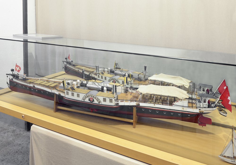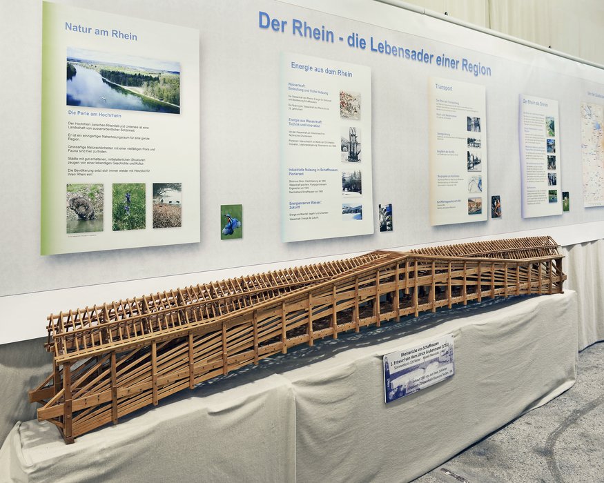 Anschauliche Objekte bereichern die Ausstellung. Dazu gehören z. B. ein Original-Grenzstein von 1839, ein Weidlingsmodell, ein Modell des  historischen Dampfschiffes „Schaffhausen“, ein Modell der legendären Grubenmann’schen Holzbrücke bei Schaffhausen, eine Original-Francis-Turbine des Pumpspeichers Engeweiher von 1939 oder schöne Präparate einer Äsche, eines Eisvogels und eines Bibers.