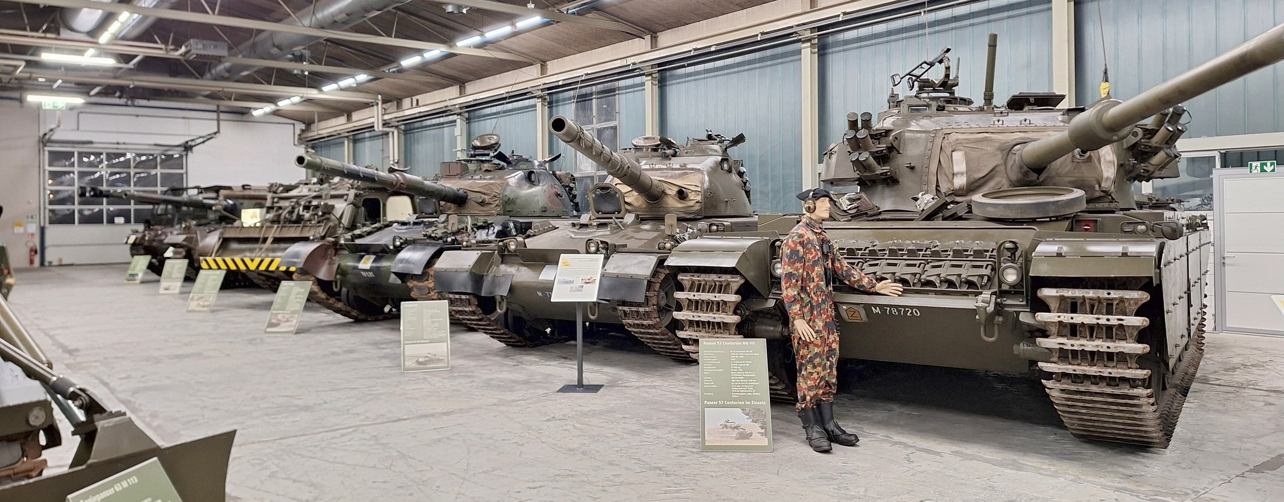 Die Ausstellung zeigt anhand der 21 historischen, betriebsbereiten Panzer des Museums den Verlauf sowie die technischen und taktischen Hintergründe der Mechanisierung unserer Armee. Die einzelnen Entwicklungsschritte sind durch mindestens ein Fahrzeug dargestellt und auf Informationstafeln einfach und verständlich erklärt. Historische und aktuelle Videoaufnahmen ergänzen die Exponate. Ab 1957 wurden wichtige Teile (Wannen und Türme) der Schweizer Panzer und des Panzers LEOPARD in der ehemaligen Stahlgiesserei von Georg Fischer in Schaffhausen gefertigt.